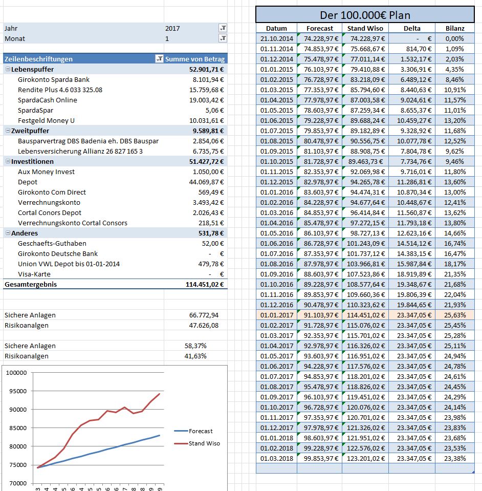 Vermögen aufzubauen. Hier habe ich analog zum einfachen Lebensplan mir einen 100.000 Euro Plan erstellt und jeden Monat die Zahlen aktualisiert. Zum einen war dies sehr motivierend und zum anderen hatte ich auf dem Weg zu den 100K die volle Kontrolle und Verantwortung.