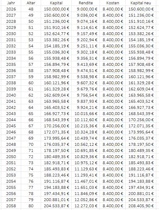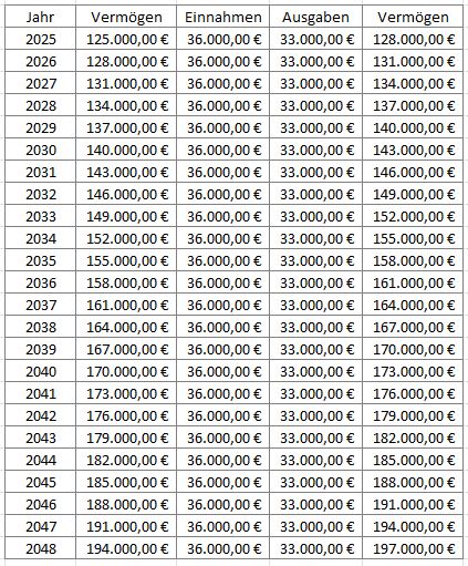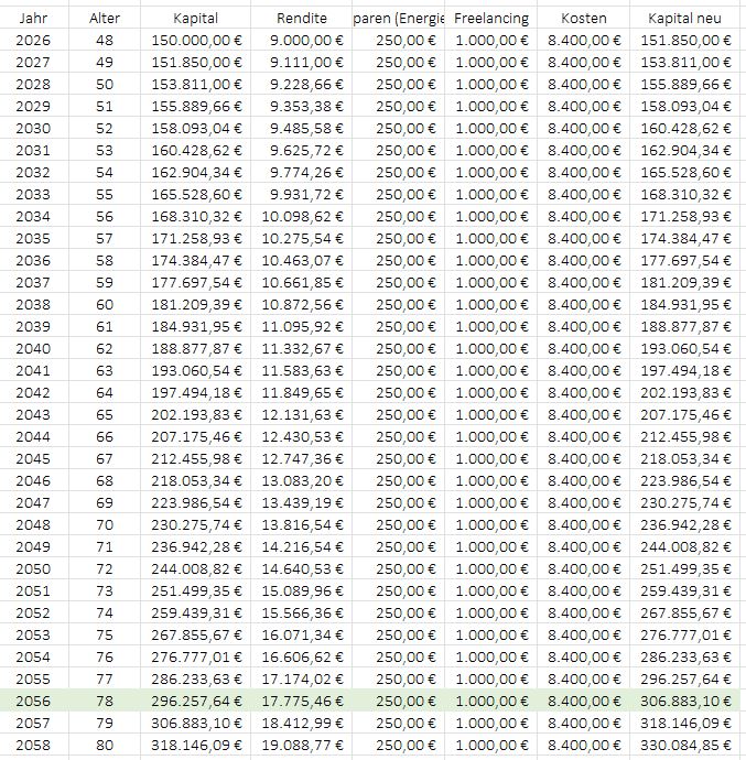 Natürlich kannst du es auch komplexer machen und weitere Informationen mit in der Planung verarbeiten. Dazu gehören Inflation, zukünftige Rente, Einsparungen, Verdienste und mehr …