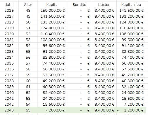 Hier nehmen wir die 150.000 Euro und ziehen in jedem Winter die 8.400 Euro Kosten ab, die für 120 Tage bei 70 Euro pro Tag benötigt werden. Das schaut dann wie folgt aus: