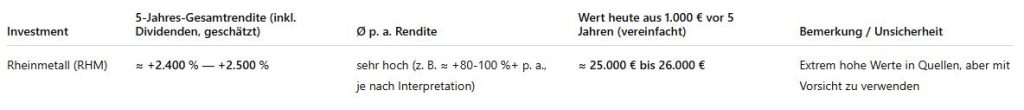 Gleichzeitig kann ich in dieser Hinsicht erkennen, dass beispielsweise Rheinmetall der Superheld in meinem Depot bei den Investments war. 😉