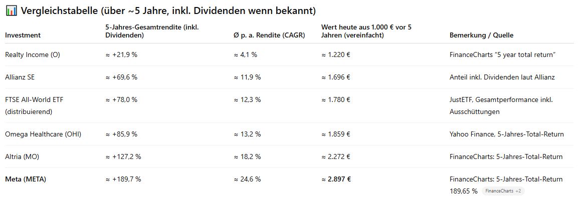 Hier kannst du sehr gut erkennen, dass die geliebte Dividendenaktie Realty Income ganz schön hinter dem Mittel zurückhängt. Hättest du vor fünf Jahren stattdessen in den FTSE All World investiert, dann wärst du jetzt 500 Euro reicher. Bei der unbeliebten unethischen Aktie (Altria) wurde nicht nur der Index geschlagen, du wärst doppelt so reich.