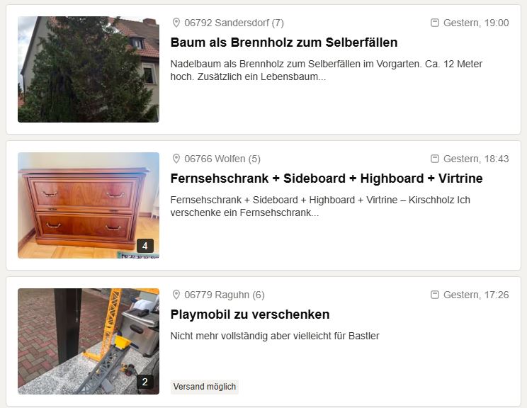 Wir leben in einer Überflussgesellschaft und da gibt es sehr viel gratis. Wenn ich beispielsweise jetzt in Kleinanzeigen reinschaue, dann bekomme ich mein Holz für den Winter, einen TOP Fernsehschrank mit Sideboard und Playmobil kostenlos, wenn ich das möchte. Glaubst du nicht? Hier der Beweis. 😉