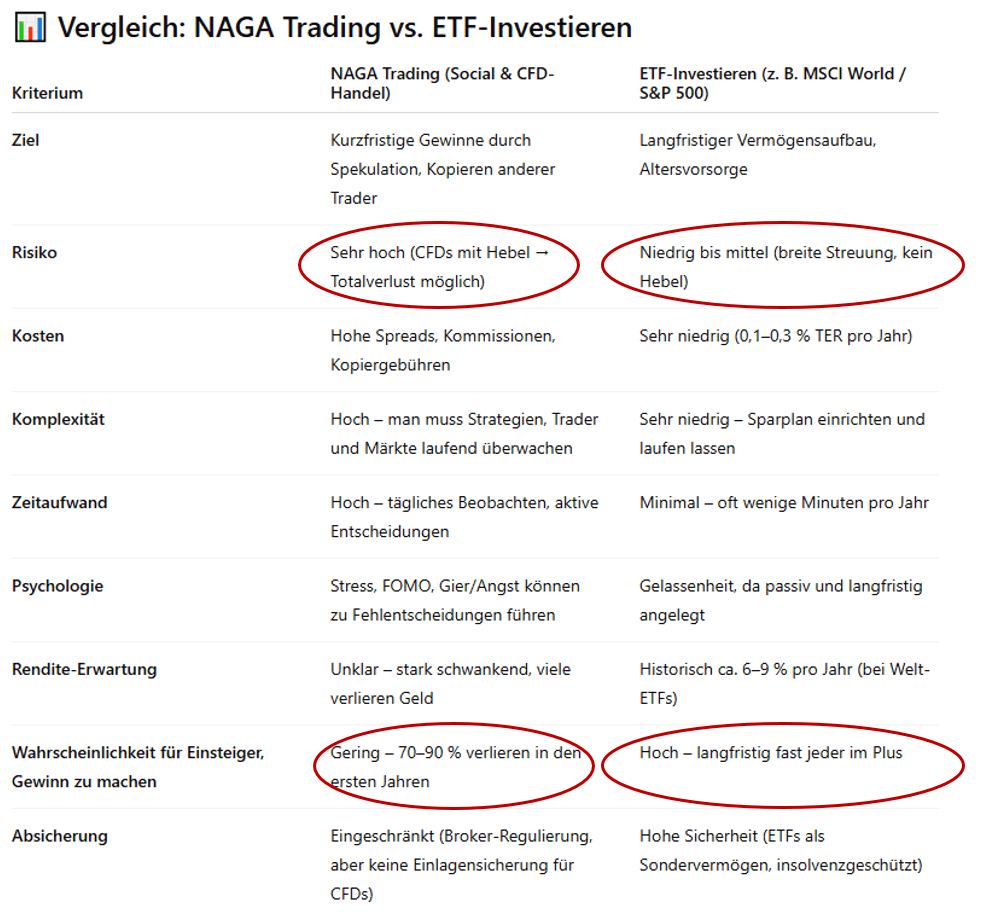 Erst einmal vorneweg ein Vergleich zwischen dem Naga Trading und einem rational klassischem ETF (Quelle Google KI)